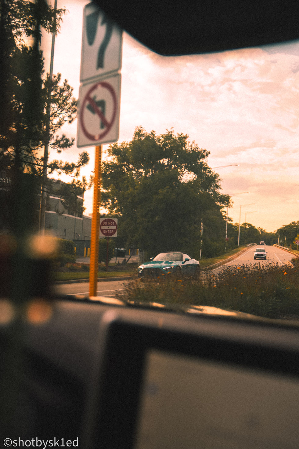 A series of images capturing urban street scenes, including a building entrance, a blurry car interior view, and cars driving on a highway.